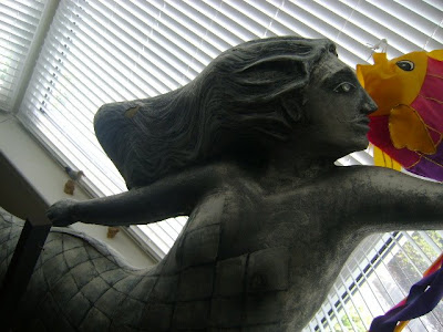 This "lazy" lady has suffered damage from a broken stand. In spite of the large crack on her torso, she is still majestic enough to impress. She is awaiting repair and I will update my information once she is again in public.