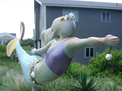 Her highness is a rare concrete mermaid but she carries her weight well. Her tail is inset with a tile mosaic and she dons several types of sea shells. She is also the only mermaid in Sandbridge surrounded by more than a dozen Promise Dolphins.